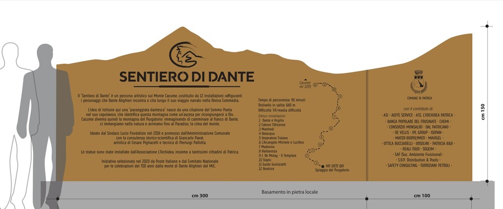 Il “Sentiero di Dante” è stato realizzato su iniziativa del Sindaco Lucio Fiordalisio e l’Amministrazione Comunale di Patrica, con la consulenza storico-scientifica di Giancarlo Pavat e la consulenza artistica di Cesare Pigliacelli.