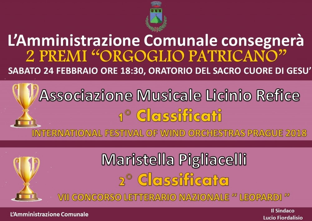 L'Amministrazione Comunale consegnerà due Premi "Orgoglio Patricano" alla Banda Licinio Refice, e a Maristella Pigliacelli.