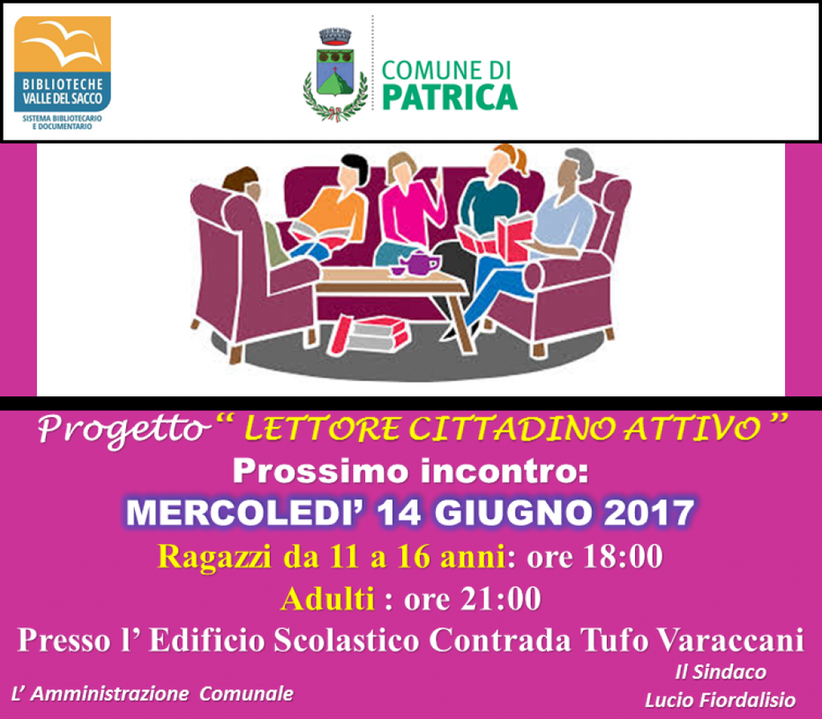 Si è tenuto ieri sera il primo incontro di presentazione del Progetto " Lettore Cittadino Attivo", pensato e finanziato dal Sistema delle Biblioteche della Valle del Sacco e sposato con entusiasmo dall'Amministrazione Comunale di Patrica.