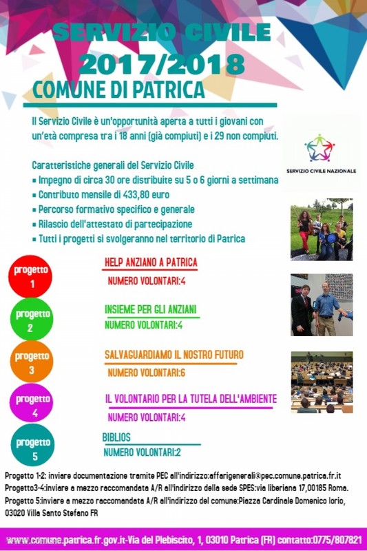 TUTTI I PROGETTI AVRANNO COME SEDE DI SVOLGIMENTO IL COMUNE DI PATRICA