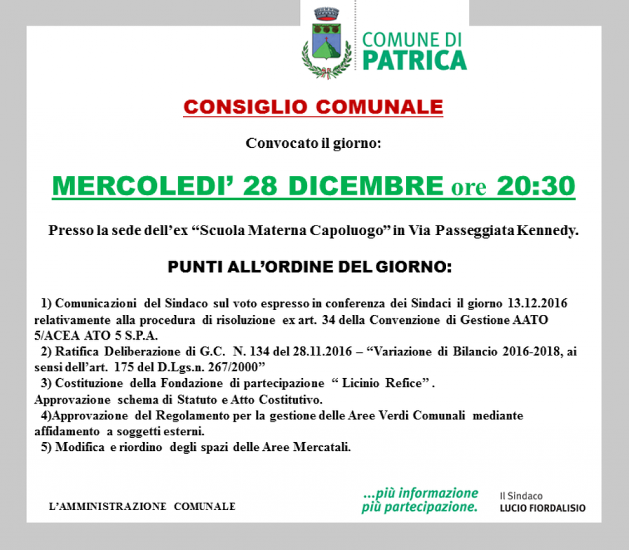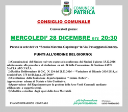 Consiglio Comunale convocato il giorno mercoledì 28 dicembre ore 20:30 presso la sede dell'ex "Scuola Materna Capoluogo" in via Passeggiata Kennedy