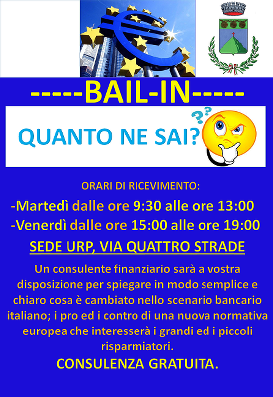 Un consulente finanziario sarà a vostra disposizione per spiegare in modo semplice e chiaro cosa è cambiato nello scenario bancario italiano; i pro ed i contro di una nuova normativa europea che interesserà i grandi ed i piccoli risparmiatori.