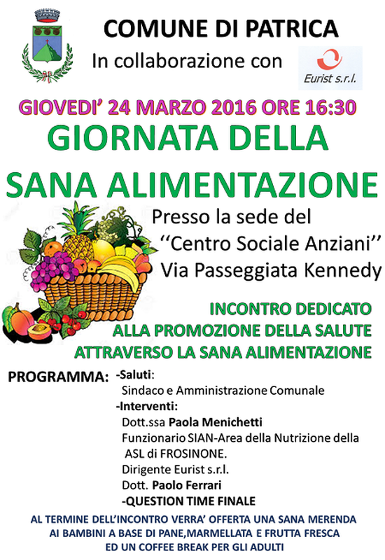 Giovedì 24 marzo 2016 alle ore 16:00, presso la sede del "Centro Anziani" in Via Passeggiata Kennedy, si terrà l'ncontro dedicato alla promozione della salute attraverso la sana alimentazione.