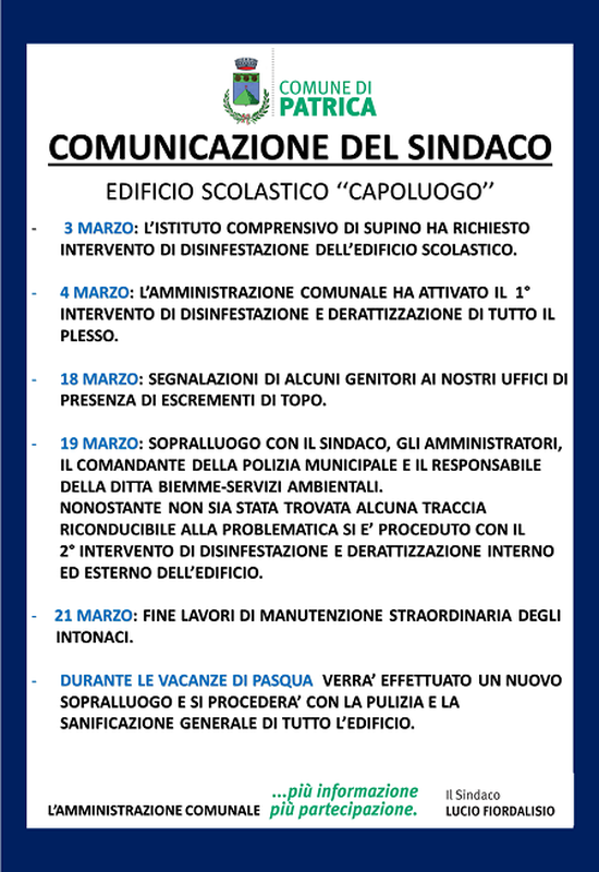 - 19 MARZO: sopralluogo con il Sindaco, gli amministratori, il Comandante della polizia municipale e il responsabile della ditta Biemme-Servizi Ambientali. Nonostante non sia stata trovata alcuna traccia riconducibile alla problematica si è proceduto con il 2° intervento di disinfestazione e derattizzazione interno ed esterno dell'edificio.