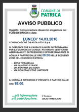 Si comunica che a causa di lavori in programma per la giornata di lunedi, potranno verificarsi abbassamenti di pressione e diffuse mancanze di acqua a partire dalle ore 08:00 nelle seguenti zone del Comune di Patrica: