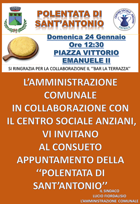 L'Amministrazione Comunale In collaborazione con il Centro Sociale Anziani, vi invitano al consueto appuntamento della "Polentata di Sant'Antonio".