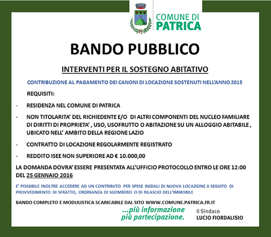 - Residenza nel comune di Patrica.