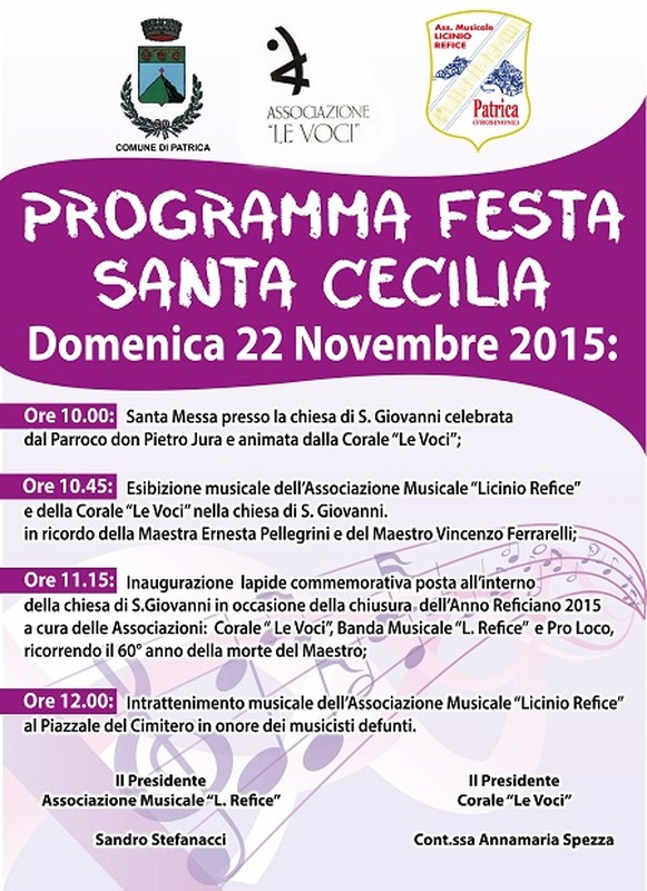 - Ore 11.15 - Inaugurazione lapide commemorativa posta all'interno della chiesa di San Giovanni in occasione della chiusura dell'Anno Reficiano 2015 a cura delle Associazioni: Corale "Le Voci", Banda Musicale "L. Refice" e Pro Loco, ricorrendo il 60° anno della morte Maestro.