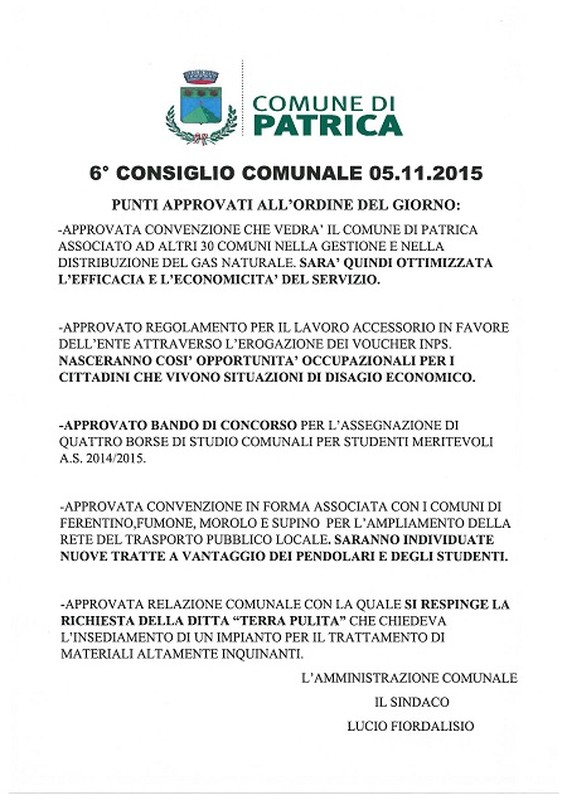 1) Approvata convenzione che vedrà il Comune di Patrica associato ad altri 30 comuni nella gestione e nella distribuzione del gas naturale. Sarà quindi ottimizzata l'efficacia e l'economicità del servizio.