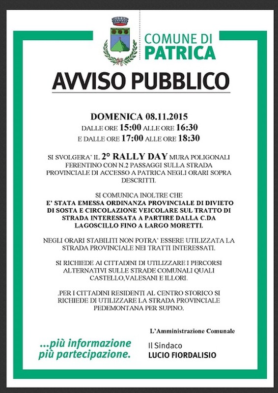 Il Comune di Patrica informa che domenica 08.11.2015 dalle ore 15:00 alle 16:30 e dalle 17:00 alle 18:30 si svolgerà il 2° Rally Day, Mura Poligonali Ferentino, con n°2 passaggi sulla strada provinciale di accesso a Patrica negli orari sopra descritti.