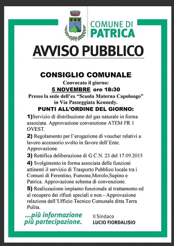 Convocato per il giorno 05 dicembre 2015 ore 18.30, presso la sede dell’ex “Scuola Materna Capoluogo” in Via Passeggiata Kennedy.