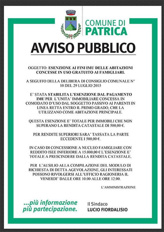 A seguito della delibera di consiglio comunale N° 10 del 29 Luglio 2015