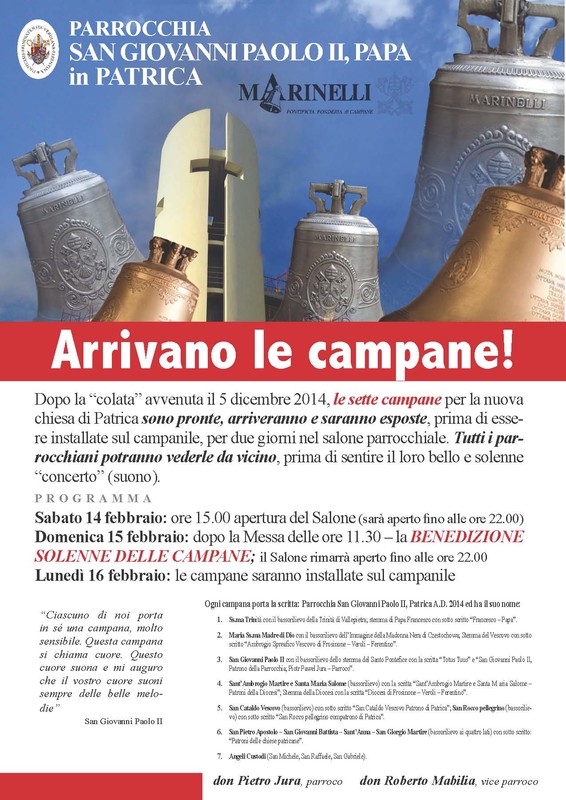 - Domenica 15 febbraio: dopo la Messa delle ore 11.30 – la BENEDIZIONE SOLENNE DELLE CAMPANE; il Salone rimarrà aperto fino alle ore 22.00.