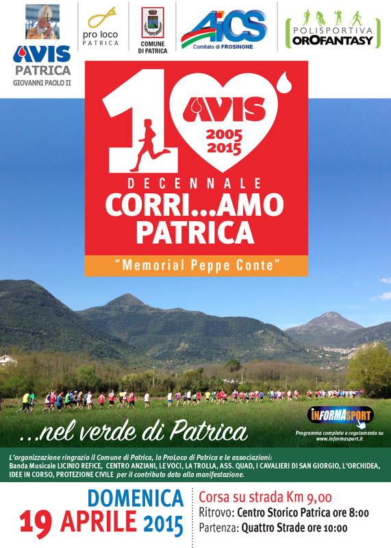 CORRI ... AMO PATRICA - 19 aprile 2015 Corsa su strada km 9,00 Ritrovo: centro storico Patrica ore 8.00 Partenza: Quattro Strade ore 10.00
