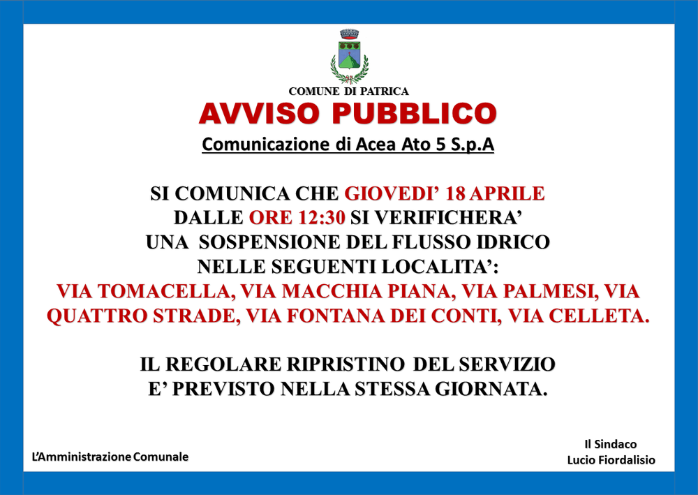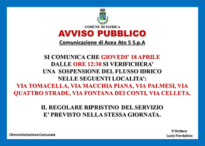 Giovedì 18 Aprile dalle ore 12.30 si verificherà una sospensione del flusso idrico.