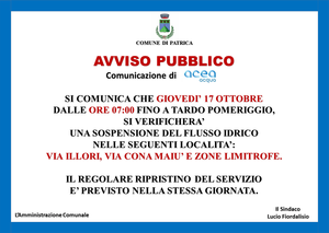 Si avvisa che nella giornata di Giovedì 17 Ottobre si verificherà una sospensione del flusso idrico