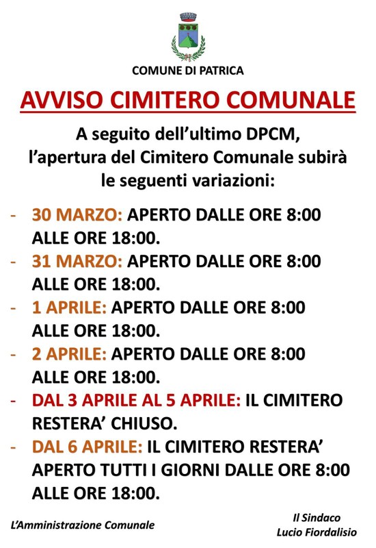 A seguito dell'ultimo DPCM, l'apertura del Cimitero Comunale subirà le seguenti variazioni: