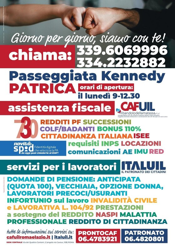 Ogni lunedì, a partire dal 10 Maggio 2021, dalle ore 9:00 alle ore 12:30, accanto l’ Ufficio della Polizia Municipale in Via Passeggiata Kennedy, verrà attivato uno sportello CAF e PATRONATO UIL.