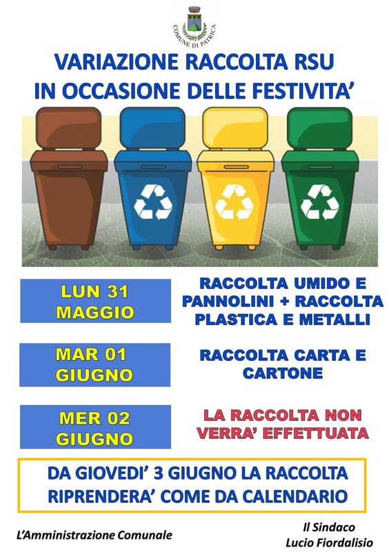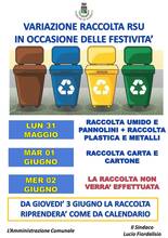 In occasione della festività del 2 Giugno, il servizio di Raccolta Differenziata subirà delle variazioni.