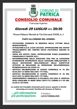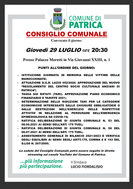 La seduta del Consiglio Comunale potrà essere seguita in diretta streaming sul canale YouTube del Comune di Patrica.