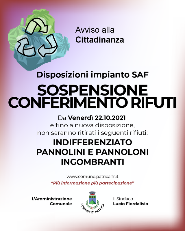 Da Venerdì 22.10.2021 e fino a nuova disposizione
